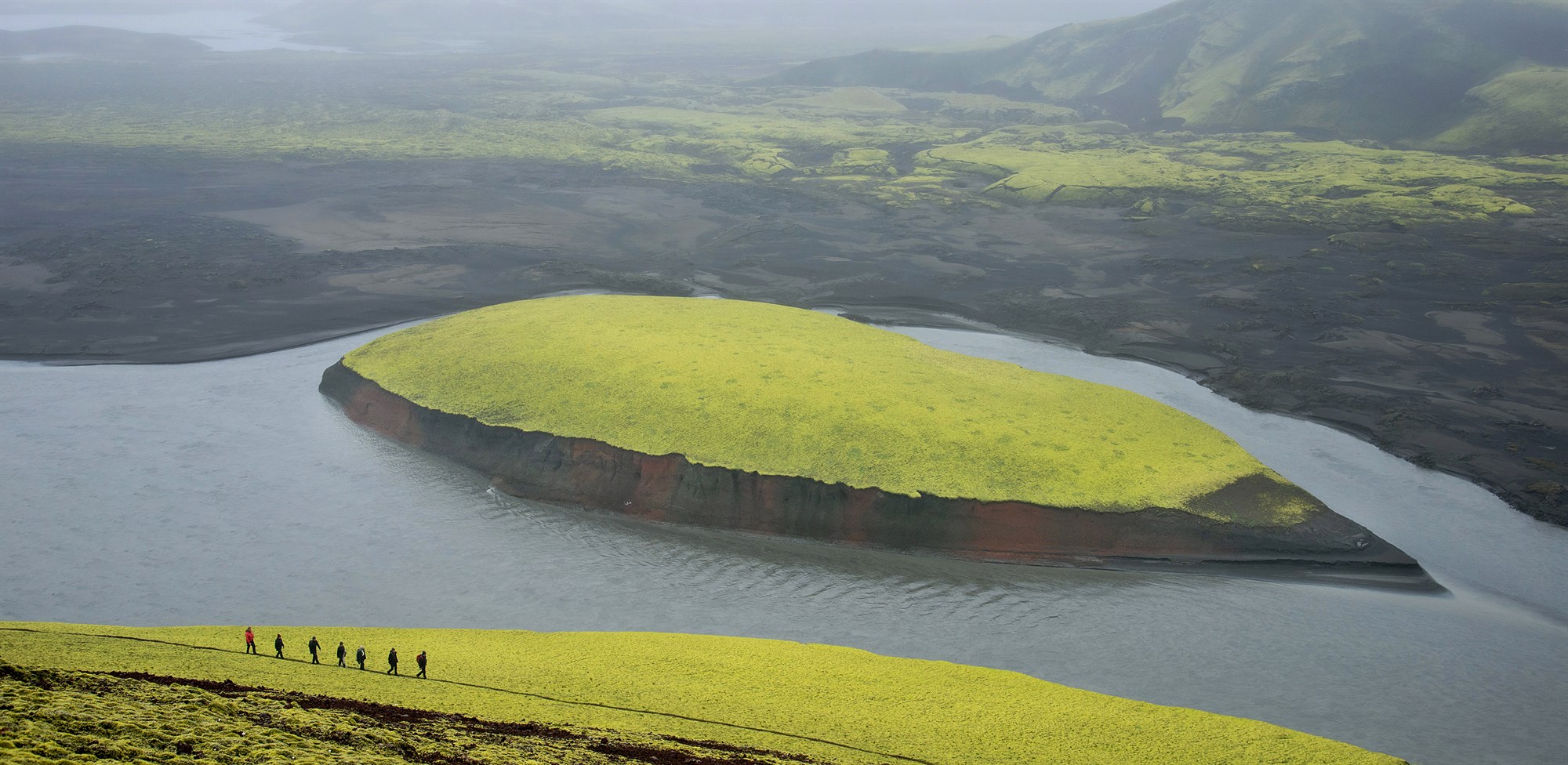 - We will hike to the top of a singular moss-covered mountain with a great view of a glacier and black sand.